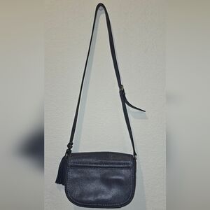 Chic dark blue crossbody bag with tassel detail. Perfect for any occasion.