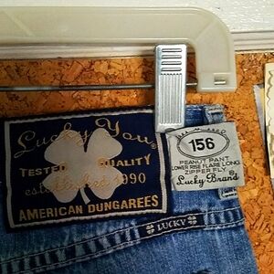 Women's Lucky Brand , Vintage Dungarees , Size:4/27, Peanut Pant, Lower Rise Flare, Long , Fly Zipper. These are 25 years, possibly older, wonderful, but who's counting. These are 100% cotton, never dried in the dryer, hang dried only. These are mine. All pictures of measurements included. Its time to pass along to someone else. Some fray at the bottom back of the jeans, but you will love them. They fit like a 26, again 100% cotton jeans. You will love them.