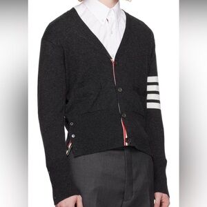 The product is an authentic Thom Browne 100% Cashmere Gray Side Button Arm Stripe Cardigan in size 3. This stylish and luxurious cardigan features a striped pattern, tight-knit design, V-neckline, and long sleeves. Made from high-quality cashmere material, it is perfect for travel, casual outings, or workwear during the winter, fall, or spring seasons. The cardigan is accented with buttons and is designed by the renowned brand Thom Browne, known for its sophisticated and high-end clothing pieces.
