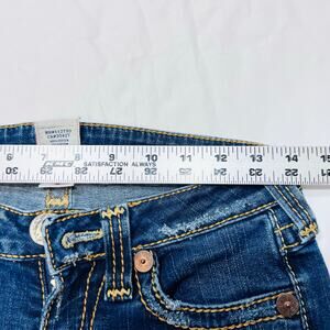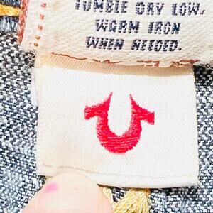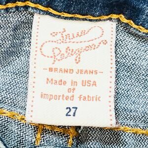 Introducing True Religion Joey Super T Flared Jeans for women, size 27W x 30L, in distressed light wash. These used jeans are in great condition and feature the iconic True Religion Joey Super T design with a vintage 1960s hippie inspired aesthetic.