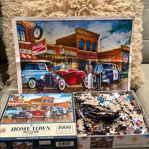 Colorful 1000 piece jigsaw puzzle featuring a vintage street scene. Includes a bonus poster.