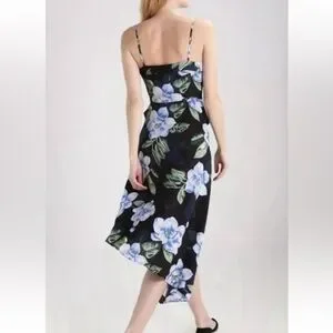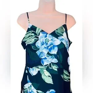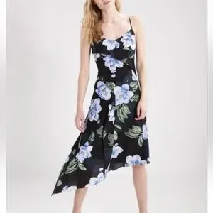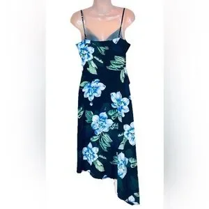 Excellent preowned condition. Black blue floral pattern, size zipper, adjustable straps, asymmetric hemline.