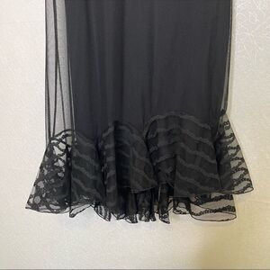 •Features: Black sleeveless mesh dress with ruffle asymmetric hem. Mesh overlay with satin like separate slip.