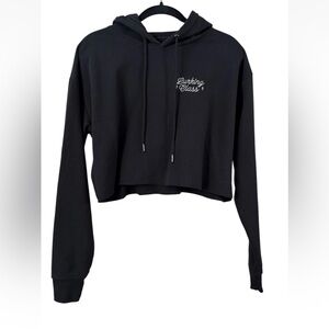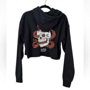 Women's Lurking Class Black Cropped Hoodie in size small. Very good preowned condition with no flaws. Bust measures 21" from armpit to armpit and length is 16.5" in front and 17" in back.
