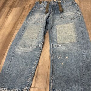 New without tags. Stylish and comfortable, these blue patchwork jeans are perfect for any casual outing. The unique design adds a trendy touch to your wardrobe. Size 27.