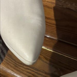 These ankle boots feature a light cream color and a textured material, offering a stylish Western-inspired look. The pointed toe and medium-height angled heel add a touch of cowboy charm, while the slightly curved shaft completes the classic design. Perfect for adding a unique flair to any outfit.