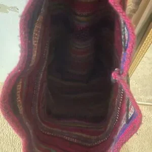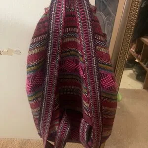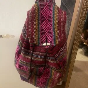Pinzon Mexico woven multicolor backpack. Vibrant and stylish, this backpack features a striking pink and multicolor pattern. Has drawstring closure and comfortable straps. One small outside pocket. Dry versatile. Can b used by both men and women . Perfect for adding a pop of color to any outfit.