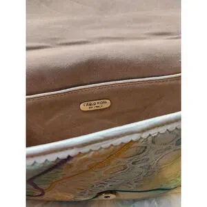 Ombre Multi-colored Pattern With A Reptile Skin Texture Print. Adjustable Tie Shoulder Strap. This Vintage Bag Has Signs Of Wear, Including Minor Discoloration And Scuffs. The Interior Is Lined With A Tan Material and Includes A Small Pocket.