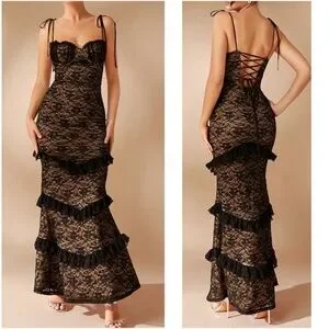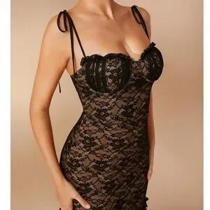 Floral lace Body con fitted Lace up back Ruffle detail High Waisted Slight str
