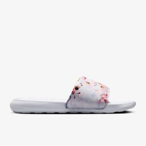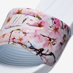 Nike slide sandals with a floral design. Features a white base with pink floral accents.