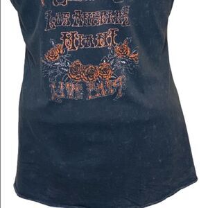 Affliction rock n eagle black and gray tank size M. 100% cotton. Studded shoulders. Eagle design on front. Major city names on back. Very good condition. Length 25” Chest 18”.