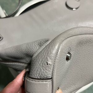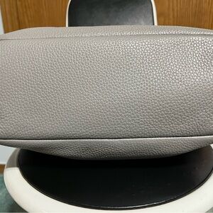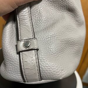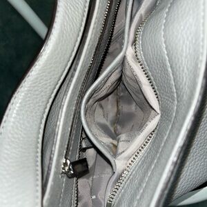 Handle drop about 6 1/2”. One exterior zip pocket at top where the main zipper is. One interior zip pocket. One large slip pocket. Two med slip pocket that has minor stain on the inside lining. Two small slip pocket. Clean interior. Small stain on back. And minor peeling of exterior material. Please see pictures. Preowned. In good used condition. Still has plenty of life left.