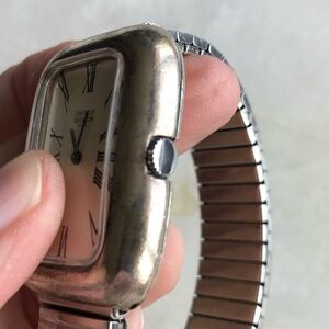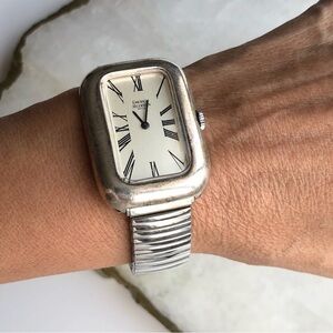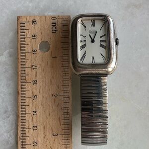 This is a classic tank shaped sterling silver case with white dial and black roman numerals. It has a quartz movement and I just had a new battery put in. It works well and is in good condiiton.