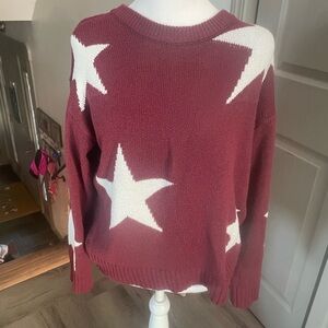 EUC This sweater features a vibrant red base adorned with striking white stars, offering a bold and stylish look. The crew neck design and soft, cozy fabric ensure comfort and warmth, making it a perfect choice for cooler days. Its eye-catching pattern and relaxed fit make it a standout piece in any wardrobe.