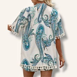 Effortless style meets vacation vibes in this breezy two-piece set. Featuring a relaxed-fit short sleeve shirt and matching drawstring shorts, both adorned with a vibrant paisley print in teal and turquoise tones. Delicate tassel trim along the sleeves and hem adds a playful boho touch, perfect for beach days, poolside lounging, or exploring your favorite getaway spot. Lightweight and breathable, this set is your go-to for staying cute and comfy in the sun.