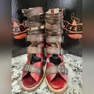 Stylish red and brown strappy sandals with a chunky heel. Perfect for a bold look.