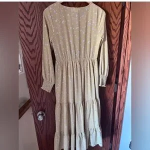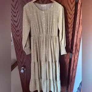 Such a darling dress for spring and summer. So feminine and flows so nicely. Tiered skirt with button front, scoop neck, elastic waistband and purple florals throughout. Great used shape and comes from a smoke free home. No major or obvious flaws found to note so there shouldn’t be anything noticeable wrong with this dress. It’s an extra small but has a bit of a flexible fit with the style and elastic waist. Cute with ankle boots and a denim jacket for a more casual look as well. Right about 48 inches in length and would be considered nursing friendly.