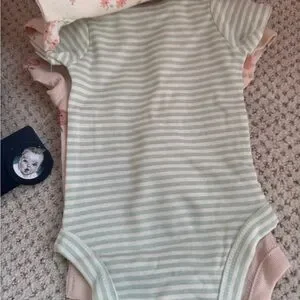 Adorable Gerber baby onesies and socks set. Includes white onesies and peach onesie with cute print. Perfect for your little one. Onesies are size newborn. Sock set are size 0-6 months.