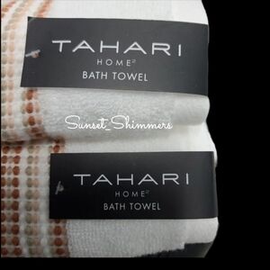 Beautiful plush bath towel set by TAHARI~ Crisp White Accented with pumpkin/rust Ombre & Tan Colored dots in a Striped pattern. 6 piece towel set includes.... (2) bath 54" x 28" (2) hand 28" x 17" (2) fingertip 18" x 12" 100% Cotton. Soooooo pretty!