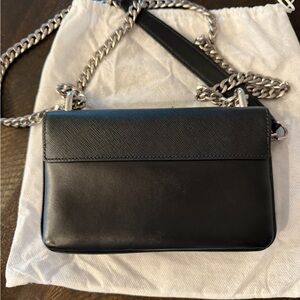 Elevate your style with this elegant Prada black leather shoulder bag. Featuring a sleek design and a chic chain strap, it's perfect for any occasion. Can be worn as crossbody or shoulder bag by moving the chain.