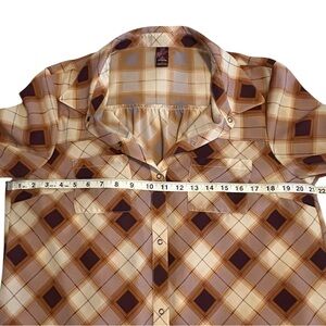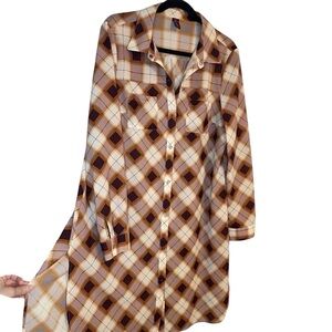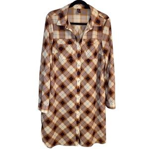 Stylish plaid button-up tunic top shirt dress in brown orange and cream. Perfect for casual outings. Comfortable and chic design. Very versatile as it can be worn multiple ways. Light weight and easy to layer with. In excellent condition. Size L