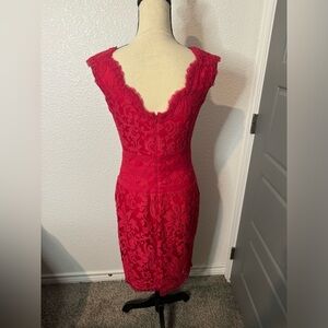 Beautiful Red embroidered lace sheath dress by Tadashi Shoji in size 4. Great condition. Really beautiful and classy. This is sleeveless and has a zipper in bag. Material is 60 percent polyester and 40 percent nylon. There is an inside liner. Measures 17 inches pit to pit and pit to hem is 31 inches. Please feel free to make a reasonable offer.