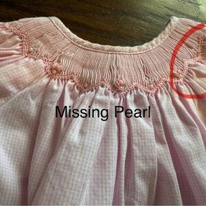 Beautiful Newborn dress with matching bloomers. Front of dress has smocking and tiny, tiny pearls with one pearl missing on the far right side. Not noticeable and the far left could be removed but leaving that up to the buyer. Otherwise in new condition. No stains