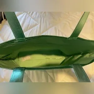 Shimmering metallic green tote bag perfect for everyday use. Stylish and spacious, this bag adds a pop of color to any outfit.