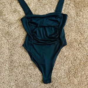 The product is a black bodysuit with ruched front and backless design, featuring a solid pattern and made of polyester and spandex knit fabric. It is designed for a size 6 woman and has a regular size type. The brand SHEIN offers this one-piece bodysuit with strap accents, perfect for those looking for a stylish and comfortable addition to their wardrobe.