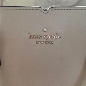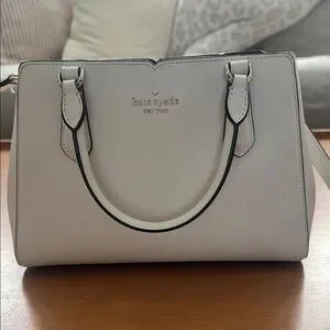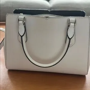 This kate spade satchel in a pristine white hue features a structured, boxy shape that exudes sophistication. Crafted from a smooth, leather-like material, it boasts two short top handles with silver-toned hardware for a touch of elegance. Its minimalist design makes it a versatile accessory for any occasion.