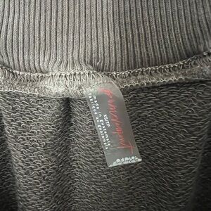 Features: Soft cotton terry, ribbed knit trim, off-the-shoulder neckline, cuffed sleeves with thumbhole detailing, elastic waistband with adjustable drawstring, pockets at hips, wide-leg silhouette