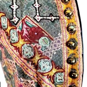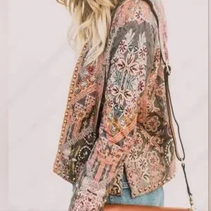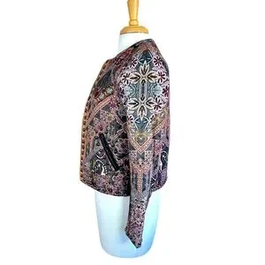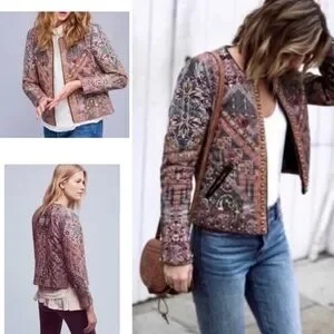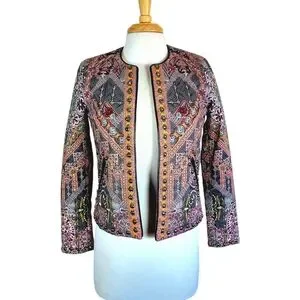 Hemant & Nandita for ANTHROPOLOGIE. Embroidered & Studded Quilted Quilt ( puffy) Jacket with faux leather trim & slash pockets. lined, Open Front. NO SIZE TAG ( Please Note Measurements) Pit to Pit is 17.5", Shoulder to hem is 21.5", 24" Sleeve ( Approx a XS/Small). Grey's, Pinks, Rusty oranges & reds, greens, Marigold yellow all mixed in printed pattern. Excellent pre-owned condition, without damage or stains, it is missing size tag, light surface wear to patina of metal studs. Smoke/Pet free environment. Bundle purchases to save greatly on shipping! ( Please Note pics came out a bit darker than actual colors due to lighting) #2/15