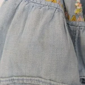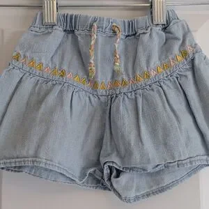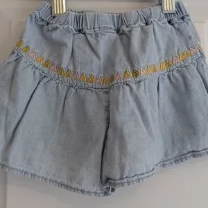 The most adorable girls shorts by Peek in size 18-24m. Wide leg makes it appear like a skirt. Stylish soft light blue denim has colorful yellow/pink embroidery. May have a faint stain as pictured, but it is not particularly noticeable IMO. Some fraying on strings.