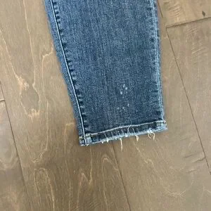 Stylish and comfortable women's distressed boyfriend fit blue jeans. Perfect for any casual occasion.