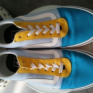 Stylish Vans sneakers with a vibrant multicolor design. Features teal, yellow, and pink accents.