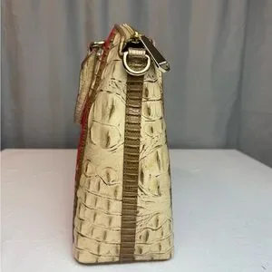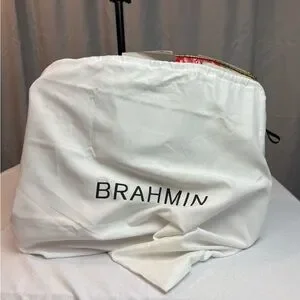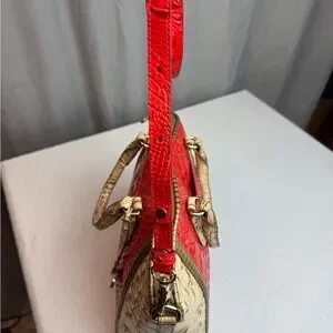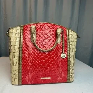 This leather bag is the Brahmin Large Duxbury Satchel in Candy Apple Red Carlisle. Stylish and elegant, this red and tan designer women's bag is perfect for any occasion. Crafted with attention to detail, it offers both functionality and fashion. Comes with detachable shoulder strap. Stored in dust bag with original packaging. From a smoke free/pet free home.