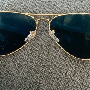 Stylish Ray-Ban aviator sunglasses in gold. Comes with a black case. Cleaner cloth and pamphlets. Never worn.