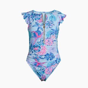 Lilly Pulitzer's Jossette rashguard one-piece showcases ruffle detailing at the shoulders and a stylish goldtone center-front zipper.