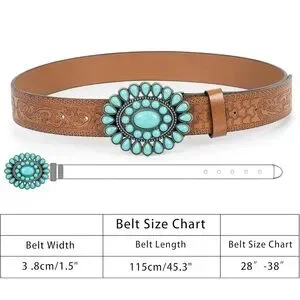 Women's vintage western turquoise buckle belt : Cowboy belts for women. Wide: 1.5 inches. Fit waist : 33"-37" waist in. Comes with 9 belt holes for plenty of room for adjustments .Western belts for women buckle features beautiful and cute turquoise and shape designs to add a western fashion touch to your overall look.