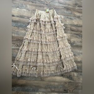 NWTs and sold out! This stunning skirt is even better in person. Photos just don’t do it justice. It has so many stunning details. Corset lace up back, bows on bottom for coquette vibes, and the most stunning texture. Designer quality, this skirt is incredible. Heirloom quality