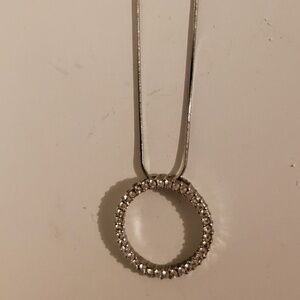 Silver plated rope necklace with silver plated circle pendant with rhinestones and clasp closure. Used. Smoke free home. Ready to ship. Approximately 15 inches in length. Outside diameter of pendant is 1 inch.