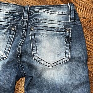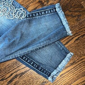 Floral embroidered low rise jeans. Button and zip closure. Hand sanding, whiskering and frayed detailing. Frayed hem. Rivet embellishments around pockets. Size 27. Rise measures approximately 8 inches, inseam is approximately 25 inches and length is approximately 32 inches.