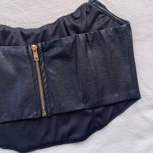 This lovely black zippered faux leather bustier crop top with boning from White Fox is in excellent, lightly pre-loved condition. No holes or stains. Size medium (please see measurements below for fit). Quite stretchy and well-structured. Has ribbed grip lining to keep this top secured to you. Very comfortable to wear.