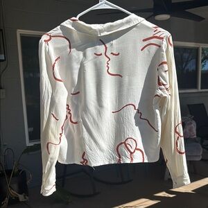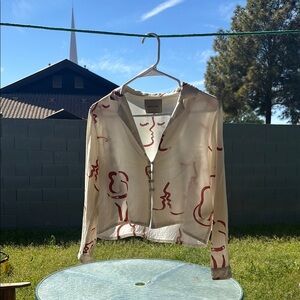 Elevate your style with this chic women's top featuring an abstract print. The cream base is beautifully accented with red designs, perfect for any occasion.
