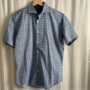 Bugatchi Shaped Fit Blue Print Short Sleeve Button Up Shirt Mens Medium