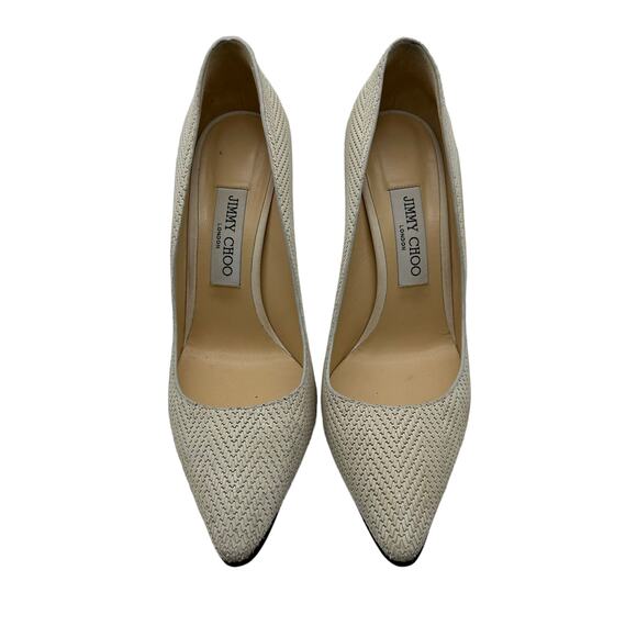 Jimmy Choo Romy Textured Heeled Pump in Ivory White. EU 38, fits like an 8. Features stiletto high heels, chevron embossed leather upper, a classic pointed toe, covered stiletto heel, lightly padded insole, slip on style, made in Italy. Leather upper, lining and sole. Approx 4” heel. Scuffs on soles and toes.