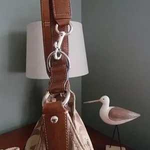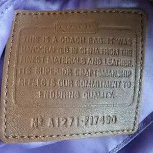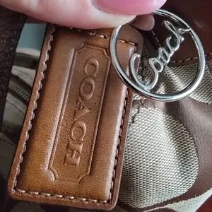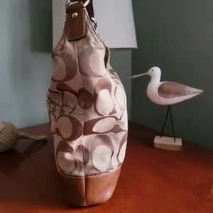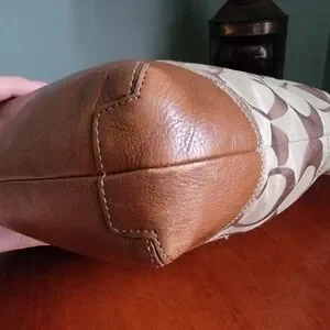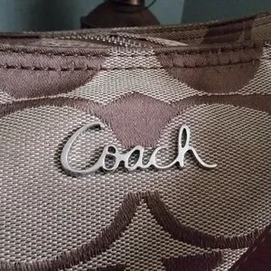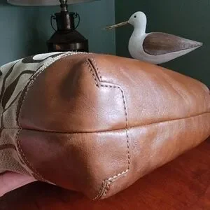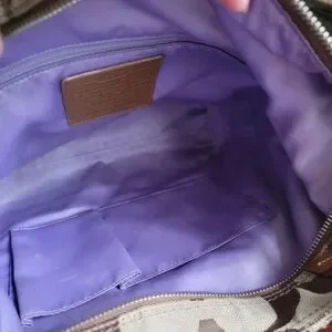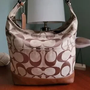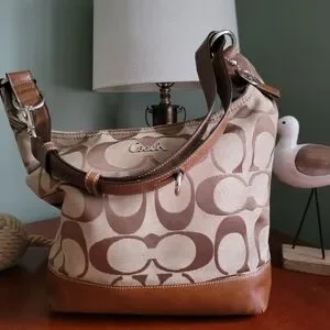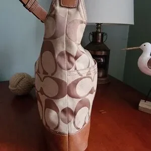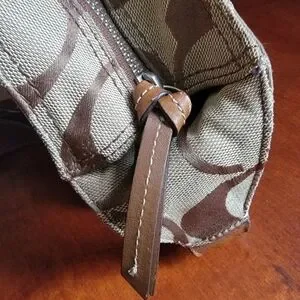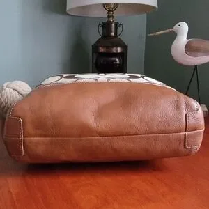 Coach North South Signature Duffel in khaki and chestnut Signature jacquard with brown leather is Coach style number F17490. Made in 2012, the body is made of Coach's Signature jacquard, and a brown/tan leather makes up the carry strap, bottom, leather pulls, and other accents. Silver-tone hardware and top-zip closure with leather zipper pull. This bag has two hangtags! One is the traditional leather tag and the other is a metal charm. Both tags are hung on the same chain. Shoulder strap is convertible and may be worn crossbody. Interior is lavender satin and has 2 slip pockets and 1 zipper pocket with leather zipper pull.