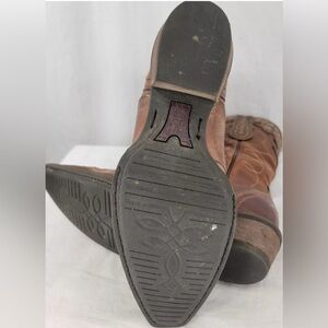 Stylish brown cowboy boots with intricate stitching. Perfect for a Western look.