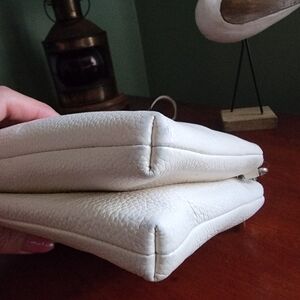 Limited Edition Baseman X Coach Kiki Lyla Bag in white pebbled leather is Coeach style number F57734. She has a special Limited Edition hangtag and was made in 2017, part of a collaboration between Coach and Gary Baseman, an American artist and cartoonist. Has silver-tone hardware. Top-zip closure on front and rear compartments, with black canvas interior and 3 multifunction pockets. Full-width center slip pocket that is accessed from the top and has a magnetic closure, with a white pebbled leather interior. Removable and adjustable crossbody strap.