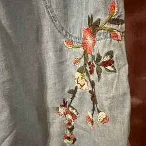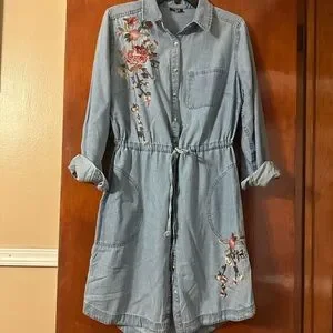 Stylish denim shirt dress with floral embroidery. Perfect for casual outings.
